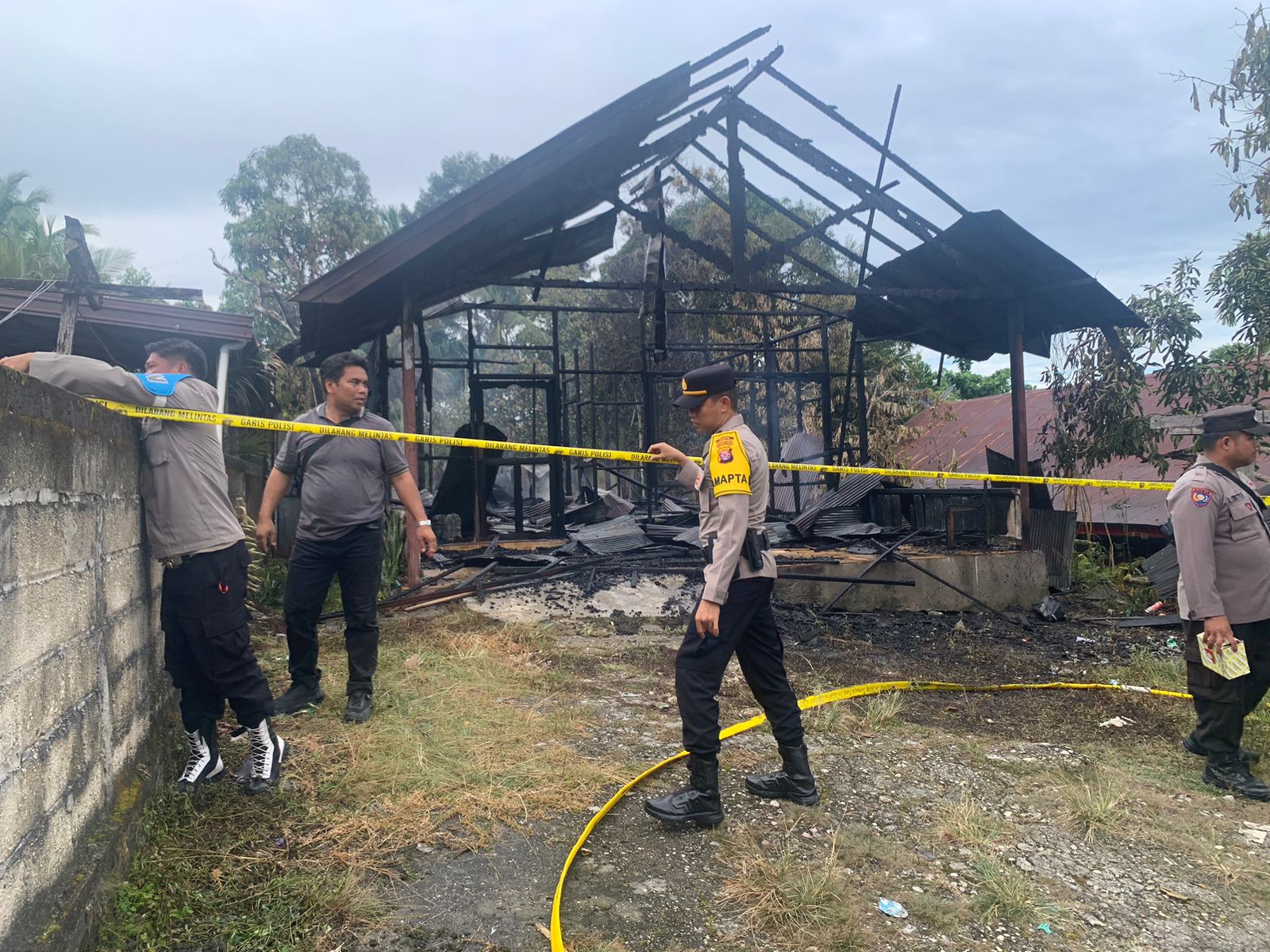 Setelah api dipastikan padam sepenuhnya, personel Polsek Kurun segera memasang garis polisi (Police Line) untuk mensterilisasi area rumah yang terbakar.